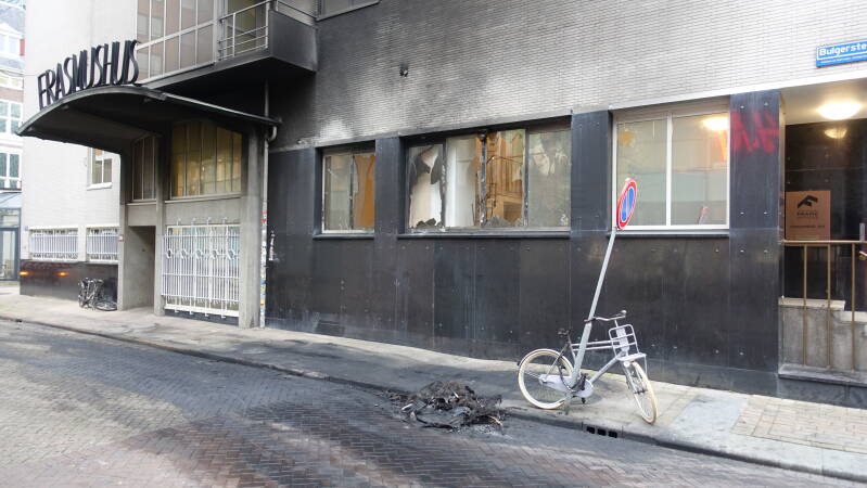 Op de Bulgersteyn, waar vrijdagavond meerdere politieauto's zwaar beschadigd raakten, is de schade bij daglicht goed zichtbaar. De gevel van het Erasmushuis is zwartgeblakerd en verschillende ruiten zijn gesneuveld. De beschadigde politieauto's worden weggetakeld.