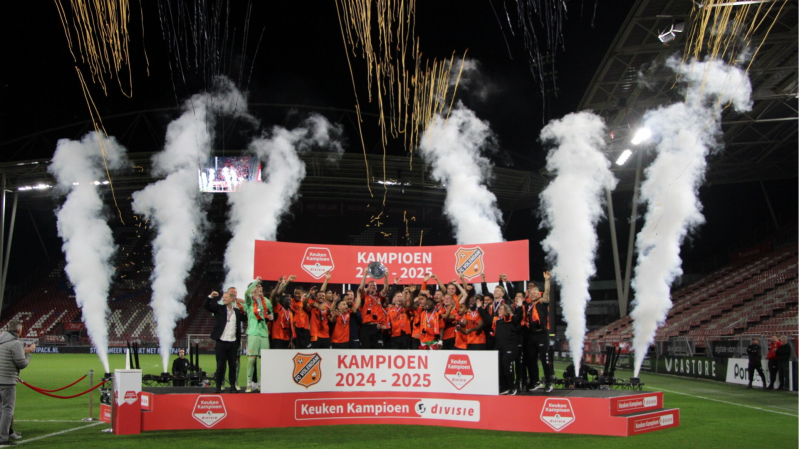 Het team van trainer Rick Kruys stond onder druk na de flinke 1-4 nederlaag vorige week tegen directe concurrent Excelsior. Daardoor moest het kampioensfeest, dat thuis had kunnen plaatsvinden, een week worden uitgesteld. Maar in Utrecht lukte het alsnog: Volendam is met nog twee wedstrijden te gaan niet meer in te halen. De club heeft nu 79 punten, acht meer dan nummer twee Excelsior, en schrijft geschiedenis met een nieuw clubrecord.